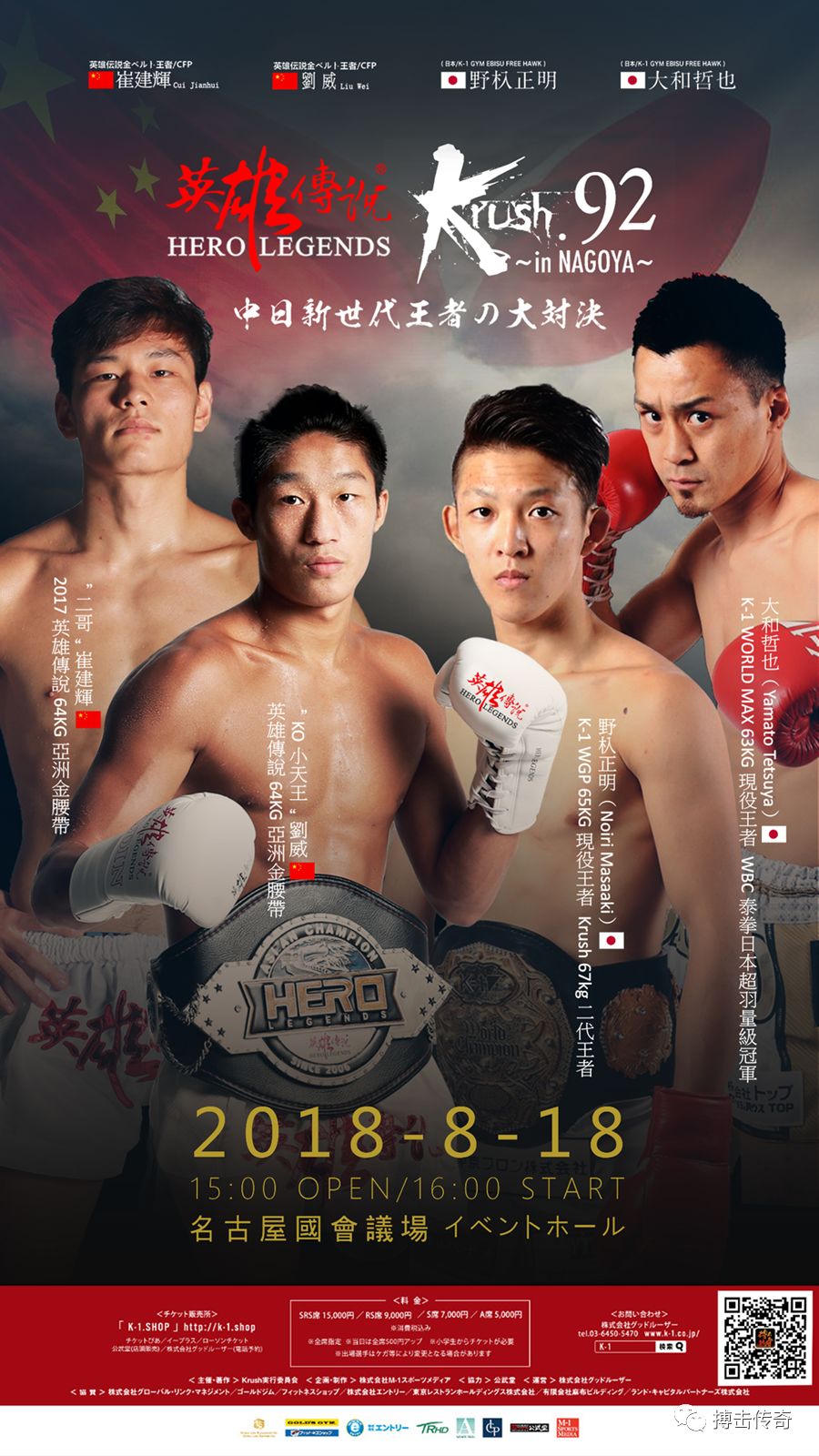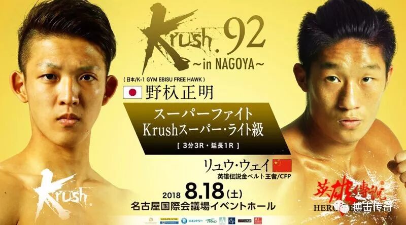 2018年6月4日,日本Krush组委会在日本东京举行新闻发布会,宣布Krush 92将于8月18日在日本名古屋拉开战幕。本次大赛最重要的比赛则是“英雄传说”金腰带拳手刘威、崔建辉将远赴日本,分别对战日本现役最强王者野杁正明(Noiri Masaaki)和大和哲也(Yamato Tetsuya)。
