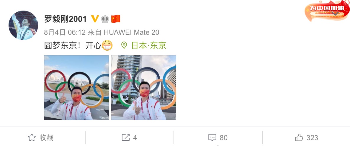 在队伍离开东京前夕,罗毅刚指导在著名的打卡景点五环标志下合影留念,并配文写道:“圆梦东京,开心!”