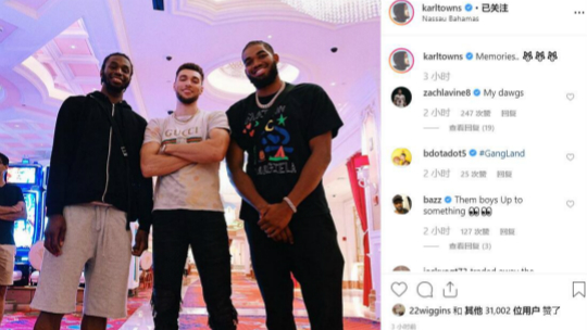 中国体育8月29日讯,公牛后卫扎克-拉文前往巴哈马探访森林狼的前队友们,唐斯晒出他和拉文、维金斯的合影,并写道:“回忆。”